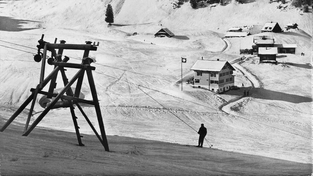 In den 1950er-Jahren war Stoos noch ein kleines Dörfchen. Für den Skisport gab es weder Pistenmaschinen noch künstliche Beschneiung. Und die Skiliftmasten, wie hier am Sternegglift, waren einfache, aber praktische Holzkonstruktionen.