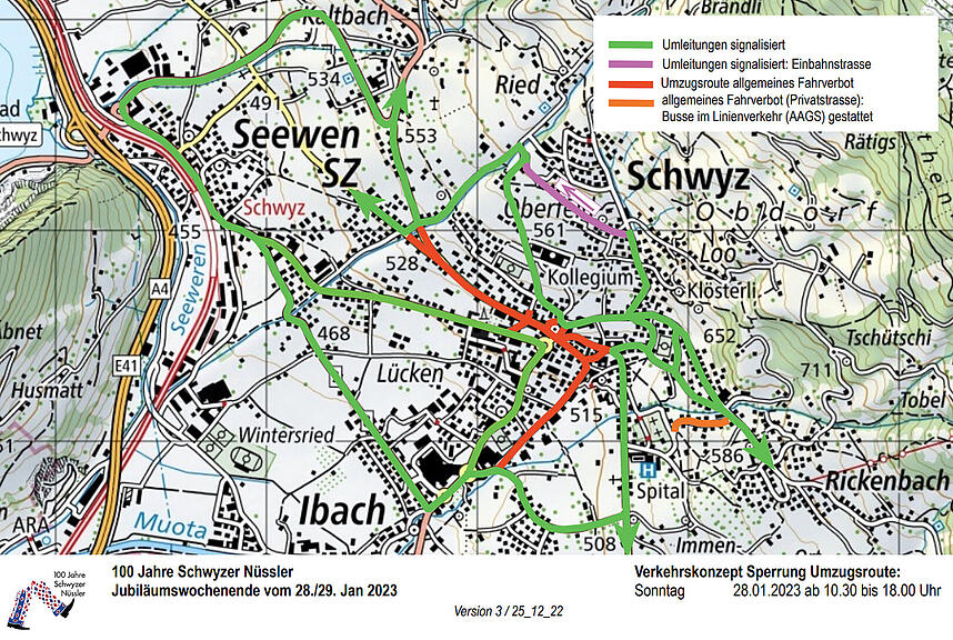 Ab dem Mittag galt rund um Schwyz ein temporäres Verkehrskonzept, gemäss den Verkehrsdiensten sicher 17 Uhr. Die direkte Zufahrt zum Hauptport von der H8 her war wegen der Strassensperrung bei der Schlagstrasse und Steinerstrasse nicht möglich. Die Herrengasse war gesperrt, ebenso der Hauptplatz, die Reichsstrasse, die Strehlgasse und die Schützenstrasse bis hinunter zur Victorinox. Das war auch die offizielle Umzugsroute. Am späten Nachmittag waren die Transitverbindungen wieder befahrbar.