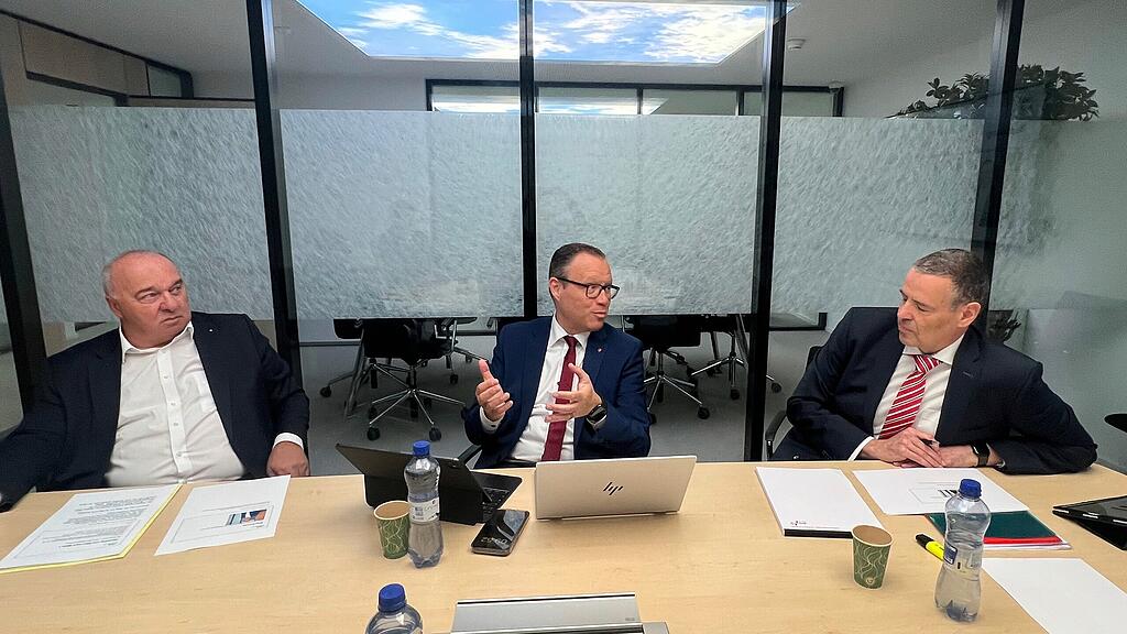 Medienorientierung am Freitag: Alex Kuprecht, Präsident der Verwaltungskommission SVA (von links), Damian Meier, Regierungsrat und Gesundheitsdirektor des Kantons Schwyz, und Peter Geisser, Vorsitzender der SVA-Geschäftsleitung.