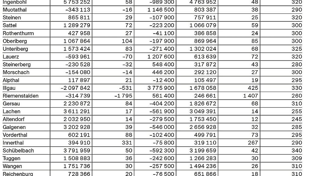 So liest sich die Tabelle: (-) bedeutet Steuererhöhung – Illgau zum Beispiel müsste den Steuerfuss theoretisch um 531 Prozent einer Einheit erhöhen, in Schwyz könnte dieser um 59 Prozentpunkte gesenkt werden.