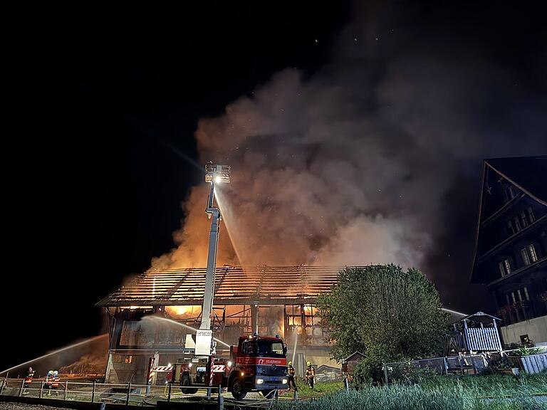 Verletzt wurde niemand. Dennoch standen vorsorglich auch der Rettungsdienst und die Rega im Einsatz. Die Besitzer des Landwirtschaftsbetriebes konnten alle Tiere rechtzeitig in Sicherheit bringen. Der Stall wurde durch die Flammen komplett zerstört.