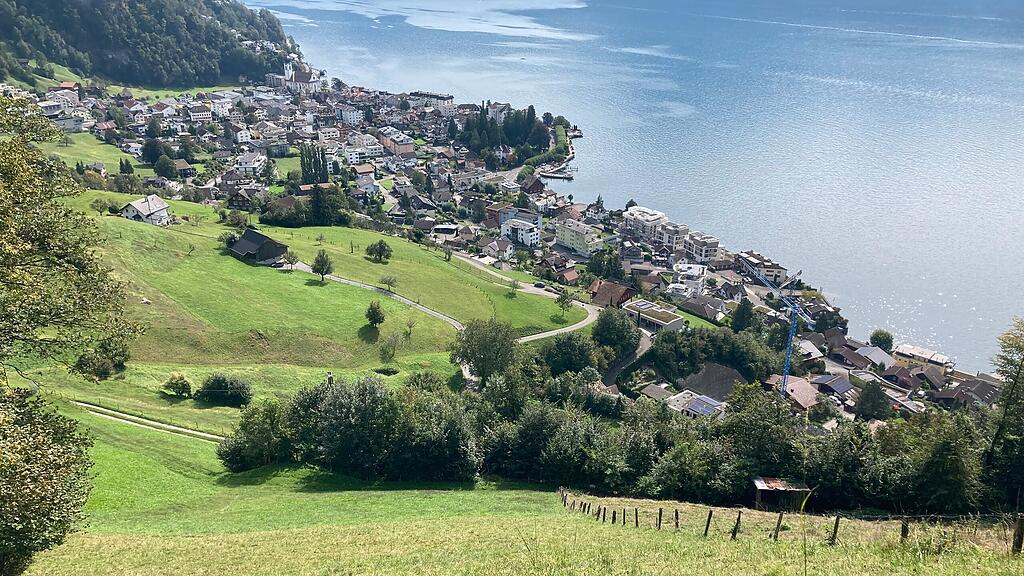 Blick vom Steilhang unterhalb des Gersauerstocks auf Gersau. Im Breitloh, auf dem Wiesland ganz links, soll einer der Geschiebesammler entstehen, um das Wohngebiet (rechts) zu schützen.