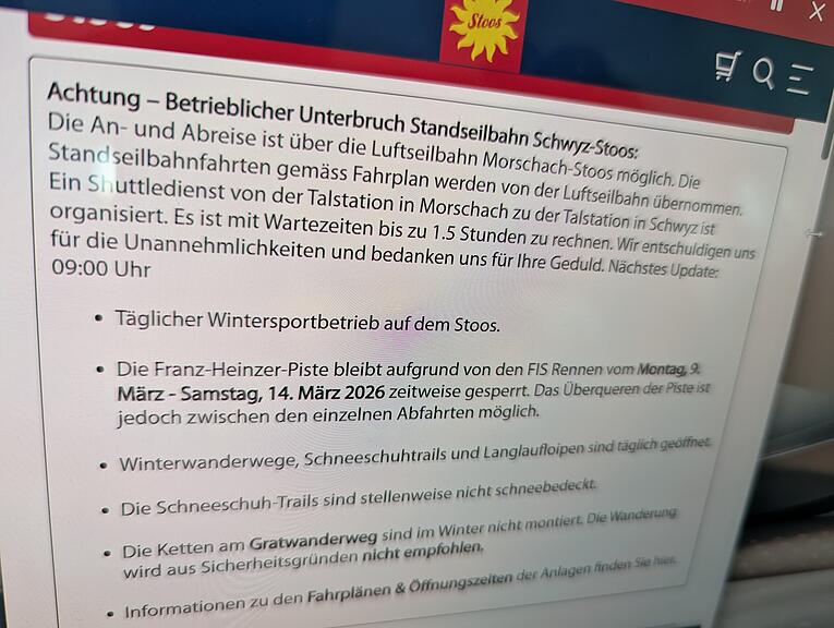 Auf Anfrage hiess es bei den Stoosbahnen, an der Behebung einer technischen Störung der Steuerung seien das eigene Technikteam als auch externe Fachleute beteiligt gewesen. Bei der Talstation der Bahn wies man mit einem schriftlichen Aushang auf die Panne hin und verwies auf die Fahrten der Seilbahn. Der restliche Winterbetrieb auf dem Stoos lief plangemäss.