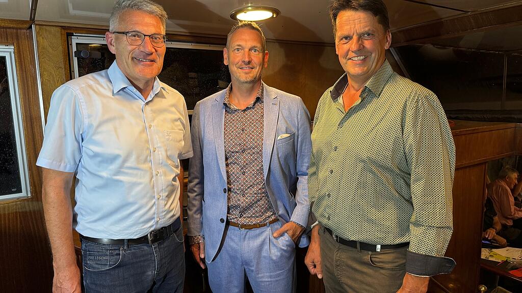 Ständerat Pirmin Schwander (von links), Bezirksrat René Hunziker und der neu nominierte Kandidat für das Amt des Säckelmeisters, Martin Weiss, an Bord des Motorschiffs Titan.