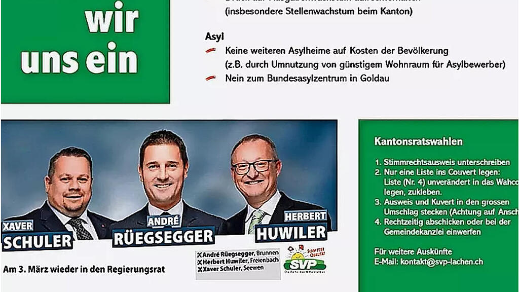 Die SVP sorgt rund um das Bundesasylzentrum mächtig für Aufsehen. Nicht nur, weil am Donnerstag in Buosingen von der Partei eine Kundgebung geplant ist. Vielmehr sind es ein Auftritt der Schwyzer SVP-Regierungsräte auf dem SVP-Flyer der Ortspartei Lachen und ein Instagram-Post der SVP-Kantonsrätin Heimgard Vollenweider, die bekanntlich gleichzeitig Arther Vizegemeindepräsidentin ist. Sie macht Werbung in eigener Sache für den Anlass in Buosingen.