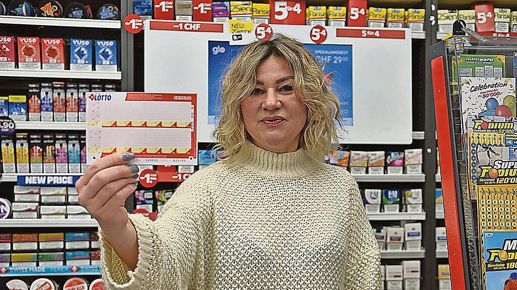 Yana Locher, K-Kiosk-Mitarbeiterin im Mythen Center, zeigt die heiss begehrten Swiss-Lotto-Scheine.