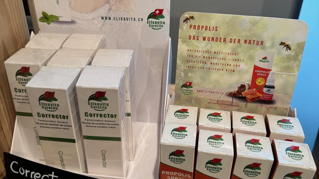 So werden die Elixavita-Produkte in Post-Filialen beworben. Auf der Kartonbox-, in der sich die Artikel befinden, ist das Schweizerkreuz auf dem Firmenlogo zu sehen. Auf den einzelnen Verpackungen nicht.