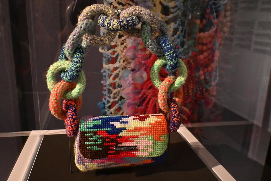 Eine aus Stoffresten und alten Duschvorhangringen designte Handtasche, mit Resten aus der Ausstattung der Netflix-Serie «Emily in Paris», hat ihren grossen Auftritt im Forum der Schweizer Geschichte. Sie passt vortrefflich in die Ausstellung «Das zweite Leben der Dinge». Die Ausstellung zeigt auf, wie unsere Wegwerfgesellschaft mit Textilien umgeht.
