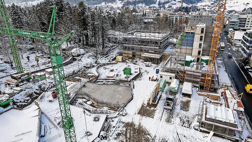 Der Neubau der Tierparks Goldau schreitet termingerecht und zügig voran. Hinten links ist der Rohbau des Verwaltungsgebäudes zu sehen, rechts die Baute des Investors und links die Räume für Bergsturzmuseum und Besucherzentrum.
