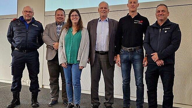 Sie referierten am Jahresrapport: Polizeikommandant Bruno Suter (von links), Sicherheitsdirektor Xaver Schuler, Andrea Ego (Amt für Umwelt und Energie), Edgar Gwerder (Vorsteher Amt für Militär, Feuerwehr und Zivilschutz), Roland Attolini (Leiter Zivilschutz) und Feuerwehrinspektor Urs Schönbächler.