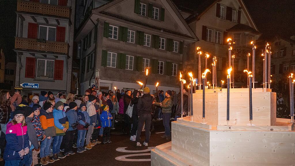 Die Geburtstagstorte auf dem Dorfplatz wurde mit den Fackeln der Riegen bestückt.