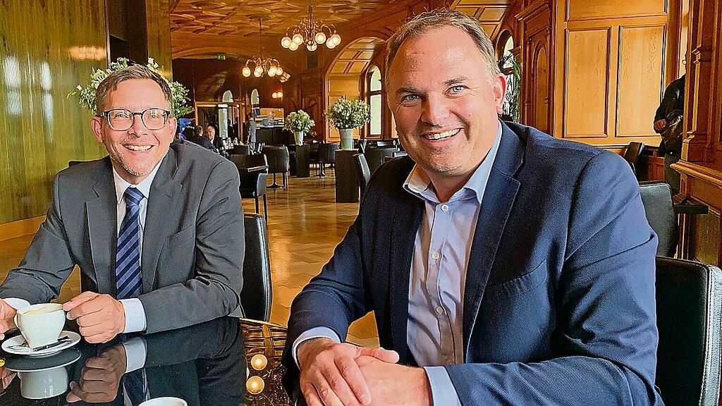 Die Nationalräte Heinz Theiler (FDP, links) und Marcel Dettling (SVP) während einer Kaffeepause im Bundeshausrestaurant Galerie des Alpes.