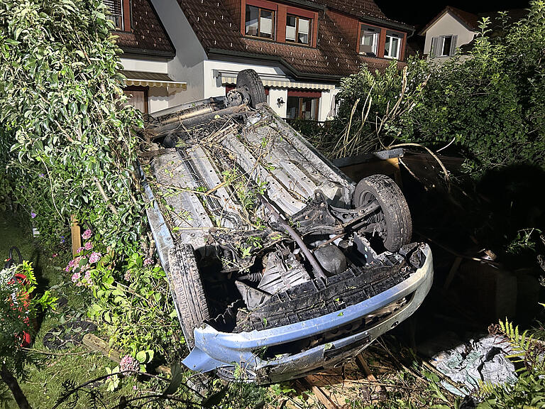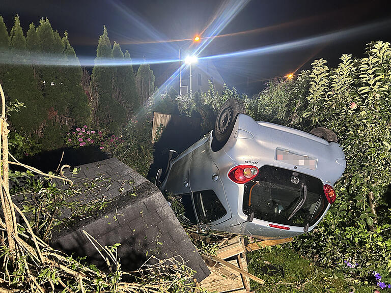 Die Kapo Schwyz teilt mit: «Dadurch wurde das Auto abgehoben, kollidierte mit einem Gartenhäuschen und kam auf dem Dach liegend in einem Vorgarten zum Stillstand.» Der Lenker des Toyota-Kleinwagens wurde beim Selbstunfall leicht verletzt und durch den Rettungsdienst in Spitalpflege gebracht. Es entstand grosser Sachschaden.