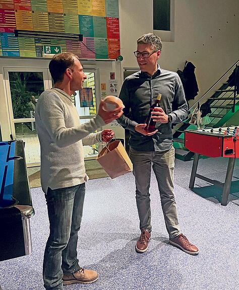 Mit Dank und regionalen Geschenken verabschiedete Präsident Michael Fuchs den langjährigen Revisor Pascal Knüsel.
