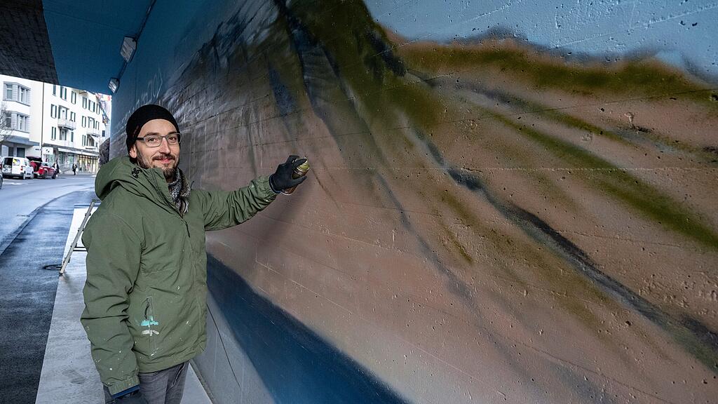 Ein gutes Beispiel dafür ist die SBB-Unterführung an der Goldauer Parkstrasse. Vorher grau, ist die Wand auf der Rossbergseite in helles Blau verwandelt worden. Die Wand wird ebenfalls Grundlage für ein fotorealistisches Kunstwerk. Auf der südlichen Unterführungsseite sieht man bereits, was hier entsteht: ein fotorealistisches Meisterwerk des Goldauer Graffiti-Künstlers Ralph Hospenthal. Aktuell verschönert er im Auftrag der Gemeinde Arth die SBB-Unterführung an der Parkstrasse – trotz frostiger Temperaturen.