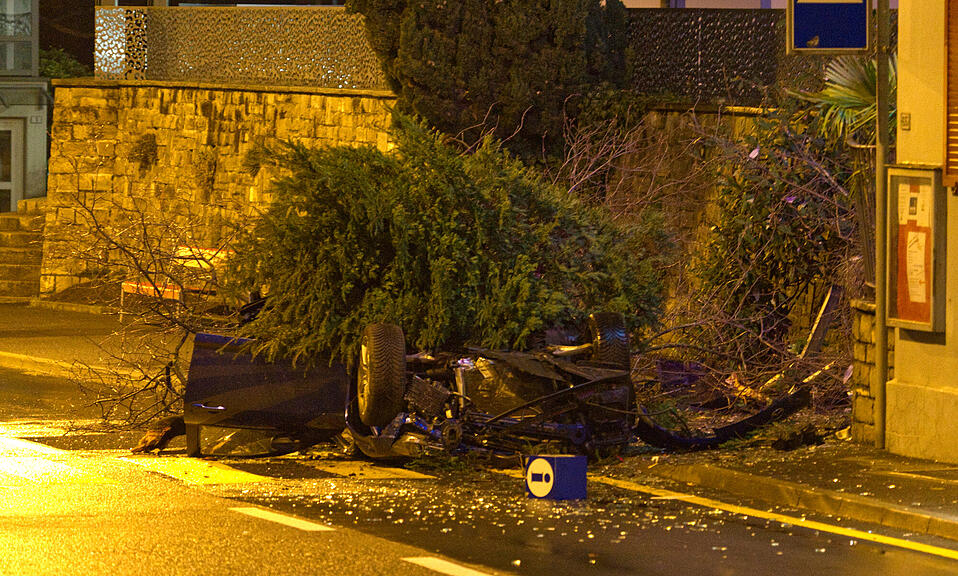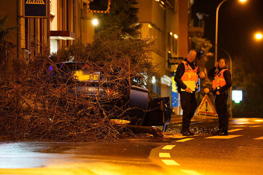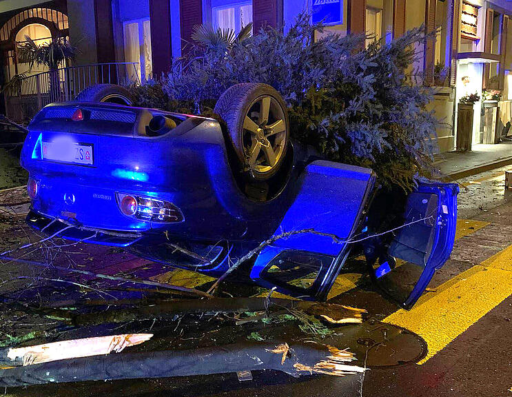 Vor dem Hotel Rigi war ein Mazda mit Schwyzer Kontrollschildern aufs Trottoir geraten und in zwei Bäume geprallt. Ein erster Baum knickte, abgerissene Äste lagen auf der Fahrbahn. Die Tanne dahinter kippte auf den überschlagenen Unfallwagen. Die Polizei schreibt zum genauen Unfallablauf: «Das Fahrzeug kam auf die Gegenfahrbahn, überfuhr das Trottoir, kollidierte mit zwei Bäumen, einer Informationstafel und einem Wanderwegweiser. Anschliessend prallte das Fahrzeug gegen ein Terrassengeländer und einer Hausmauer, bevor das Auto auf dem Dach liegend zum Stillstand kam.» Der 27-Jährige am Steuer erlitt leichte Verletzungen und wurde mit Blaulicht ins Spital Schwyz gebracht.