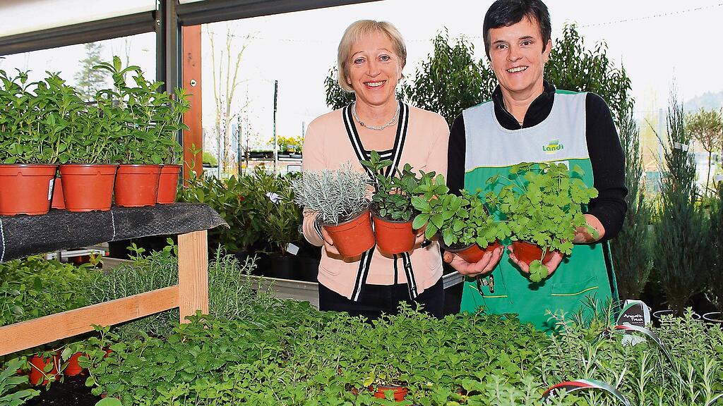 Landi-Geschäftsführerin Bernadette Kündig (links) und Blumenfachfrau Frieda Lindauer präsentieren die exotischen Bio-Kräuter Currykraut (von links), Englische Minze, Marokkanische Minze und Koriander. Bild: Christoph Clavadetscher