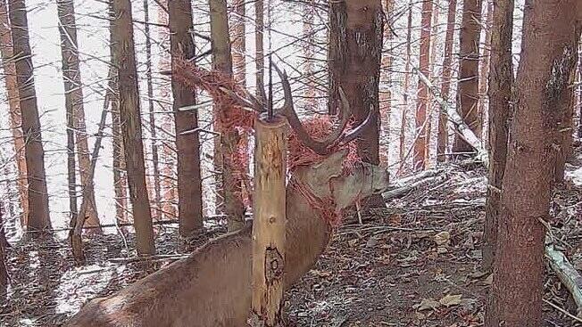 Ein Hirschstier mit Maschenzaun im Geweih und um den Hals wurde am 7. November auf dem Bild einer Fotofalle festgehalten.