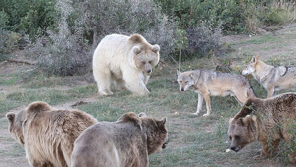 Bärin Dalia (helles Fell) ist sich das Zusammenleben mit Wölfen, wie hier zu sehen ist, von ihrer Zeit im Zoo in Tiflis bereits gewohnt.
