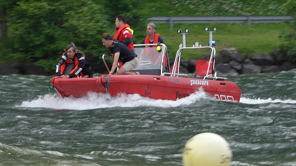 Das Lauerzer Feuerwehrboot nähert sich dem Fischer.