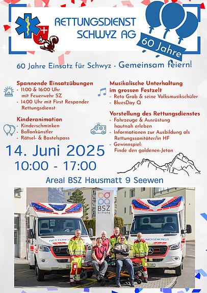 Anlässlich des 60-Jahr-Jubiläums lädt die Rettungsdienst Schwyz AG die Bevölkerung zu einem Einblick in ihr Tätigkeitsfeld ein. Diesen Anlass feiert sie gemeinsam mit der BSZ auf dem Areal der BSZ in Seewen, welche gleichzeitig eine Erkundungstour durch ihre Werkstätte ermöglicht. Für das leibliche Wohl mit Speis und Trank ist gesorgt. Der Erlös aus der Konsumation kommt vollumfänglich der BSZ Stiftung zugute.