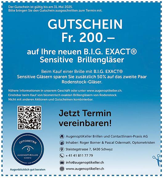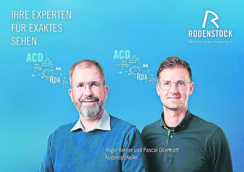 «Wussten Sie, dass nicht nur Ihre Augen einzigartig sind, sondern auch Ihre visuelle Sensitivität, also die Art und Weise, wie Ihr Gehirn Seheindrücke wahrnimmt? Rodenstock misst jetzt als erster Hersteller beides!» Pascal Odermatt und Roger Borner von AugenoptiKeller zeigen eine Sensation: «B.I.G. EXACT® Sensitive, die weltweit ersten Brillengläser, die an die individuelle visuelle Sensitivität und Biometrie Ihrer Augen angepasst sind.»