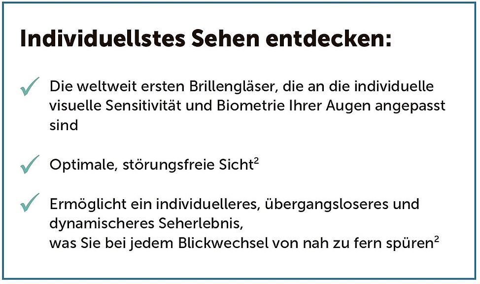 Der Unterschied? Bei jedem Blick spüren! Die Trägerinnen und Träger sehen entspannter und natürlicher, so klar und präzise wie nie zuvor. Für weniger Ermüdung beim Sehen und mehr Lebensqualität im Alltag. Eine Studie ergab: 83% der Teilnehmenden bevorzugen die neuen Brillengläser, die ihre Sensitivität berücksichtigen.