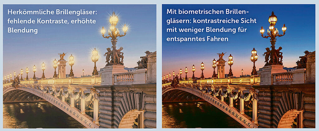 Uneingeschränktes Blickfeld und beste Sicht bei allen Lichtverhältnissen: Biometrische Brillengläser für Autofahrerinnen und Autofahrer bieten besonders grosse Sehbereiche und scharfes Sehen auch bei schnellen Blickwechseln. Nachts und in der Dämmerung reduzieren die innovativen Brillengläser Blendeffekte und störende Lichtreflexe durch moderne Scheinwerfer, Strassenbeleuchtung oder nasse Strassen erheblich – und sorgen auch bei Tag durch ihren kontraststeigernden Effekt für sicheres und entspanntes Fahren.