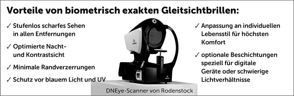 Die AugenoptiKeller-Experten sind zertifizierte Rodenstock-Partner für biometrisch exakte Gleitsichtgläser und bilden sich regelmässig weiter, um fortschrittliche Technologien optimal einzusetzen.