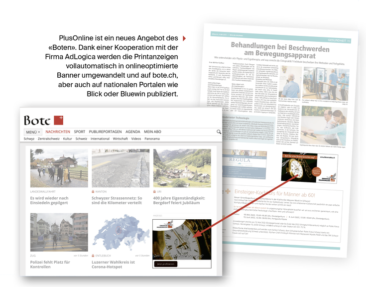 Werbung im Umfeld von regionalen News und digitales Geotargeting lassen sich aber auch problemlos kombinieren. Dadurch profitiert der Werbetreibende von der hohen Relevanz im regionalen Umfeld, und er kann zusätzliche Userinnen und User aus der Region auf nationalen Newsportalen erreichen, welche sich nicht regional informieren. Mit dem kostengünstigen und einfachen Zusatzprodukt plusOnline (siehe unten) bietet der «Bote» genau diese Kombination seinen Kundinnen und Kunden an.