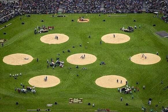 Was ich am Esaf erlebt habe, hat mich aber echt überrascht: Hier treten gleichzeitig auf sieben Sägemehlringen 14 Schwinger gegeneinander an. Ich wusste gar nicht, wohin schauen. Ein Plattwurf da, ein Sieg mit Überdrücken dort, auf Ring 3 fallen zwei Kämpfer gleich ins Gras. Dazu Chorgesänge und Jodelgruppen im Wechsel.