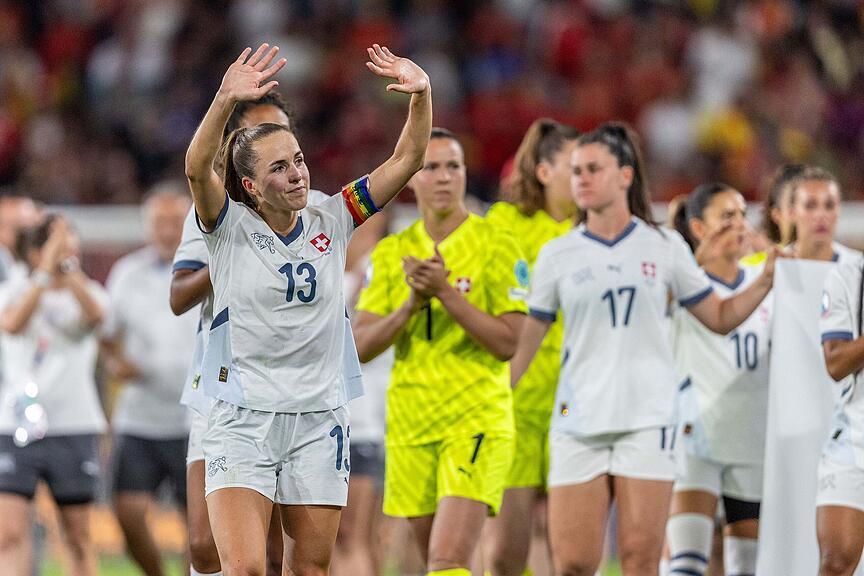 Nach dem 0:2 gegen Spanien im Viertelfinal an der Heim-EM liessen sich die Schweizerinnen auf dem trotz Regen gut gefüllten Bundesplatz in Bern nochmals ausgiebig von den Fans feiern. Damit wollten sie sich für die tolle Unterstützung bedanken.