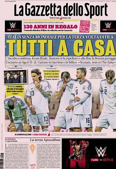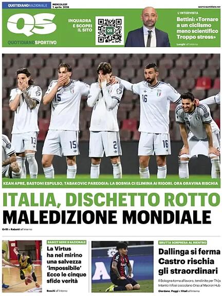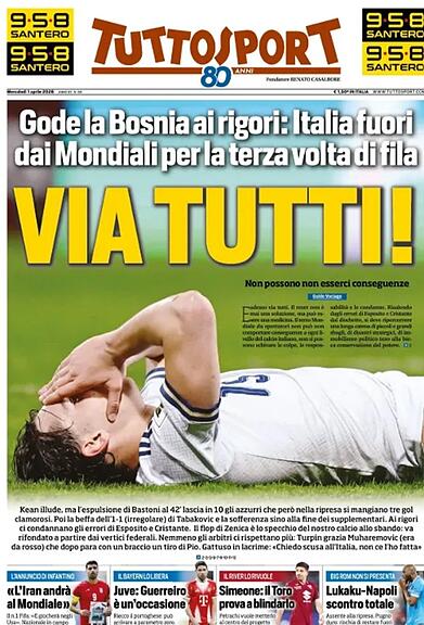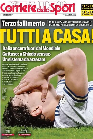 In den italienischen Medien, die nicht unbedingt für ihre Zurückhaltung bekannt sind, herrscht eine Mischung aus Unglauben und Empörung ob der chronischen Erfolglosigkeit der «Squadra Azzurra». Die Schlagzeilen ähneln sich erstaunlich und offenbaren selbst bei den sonst so wortgewaltigen Gazetten eine gewisse Sprach- und Ratlosigkeit. Praktisch unisono werden personelle Konsequenzen gefordert. Ein Überblick: