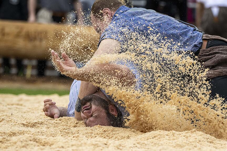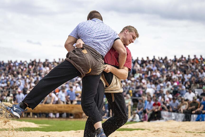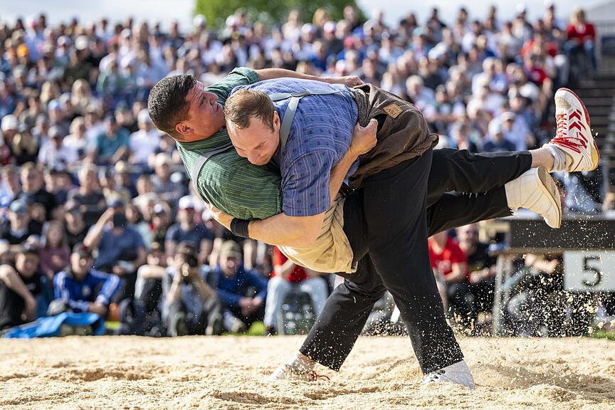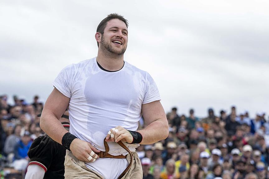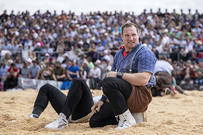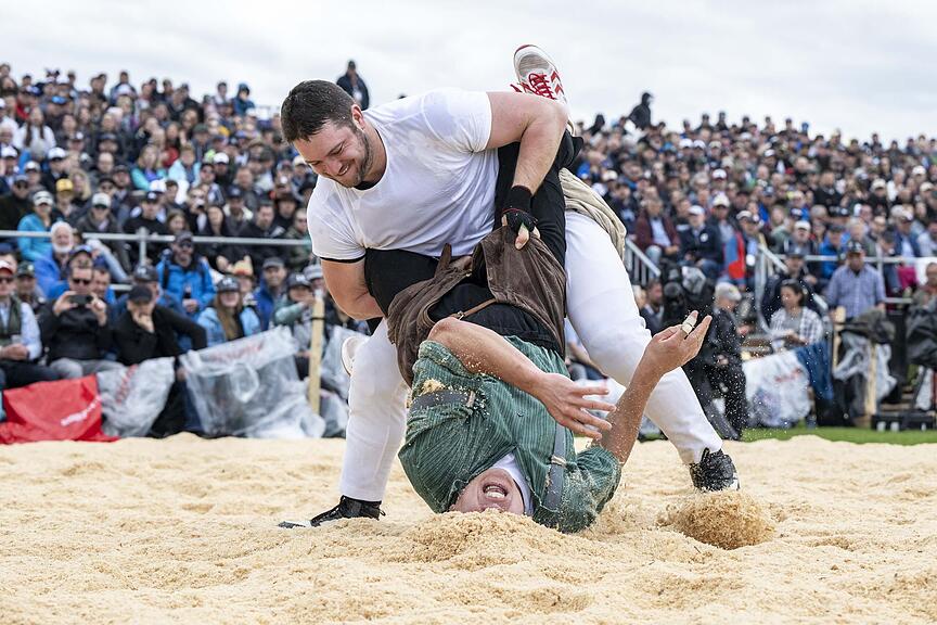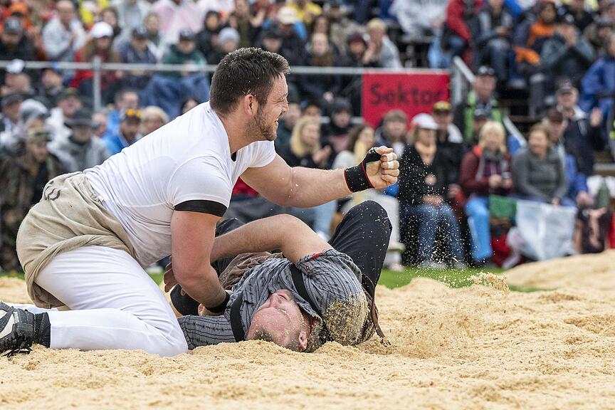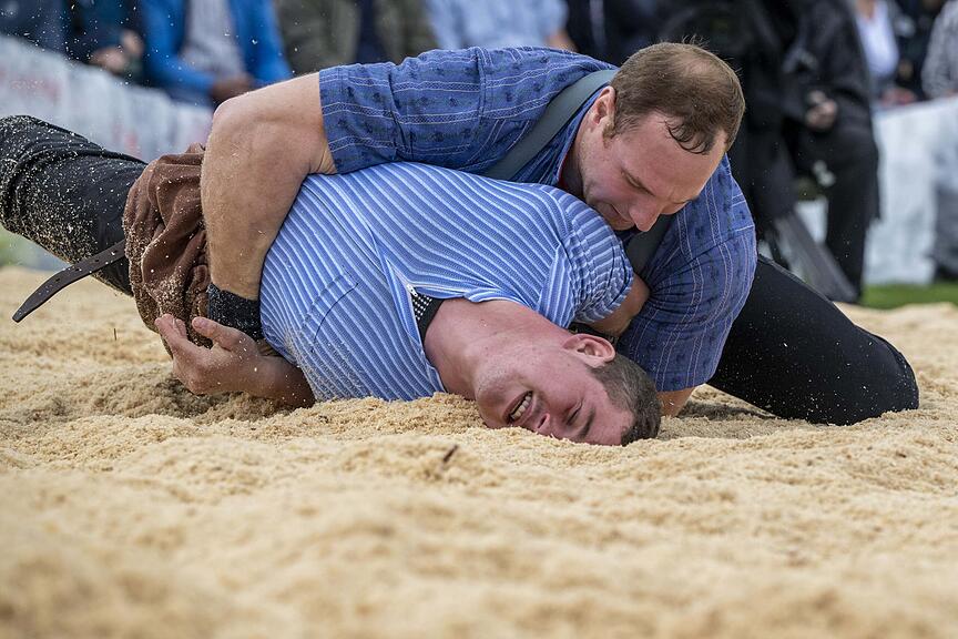 Joel Wicki gewinnt das Zuger Kantonalschwingfest in Cham. Der Sörenberger braucht im Schlussgang nur wenige Sekunden, um zum Sieg zu kommen.