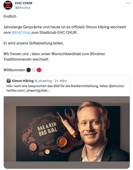 Doch alles hat ein Ende (nur die Wurst, die hat bekanntlich deren zwei). Im Frühling 2023 spüre ich, dass meine Mission in Visp erfüllt ist, als mich Twitter-User Dan Rifter darauf aufmerksam macht, ich hätte eine gewisse Ähnlichkeit mit Reto von Arx, dem Trainer beim EHC Chur. Ich könne doch dort in der Grillabteilung anheuern.