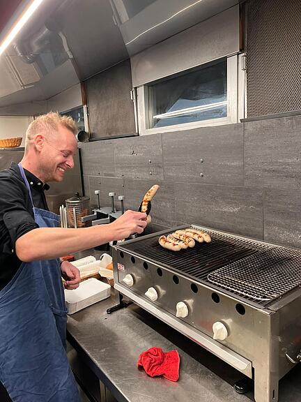 Empfangen werde ich vor der Feuertaufe von Ken Kübler, dem Leiter Sponsoring und Marketing beim EHC Chur. Er stellt mich dem Leiter Gastronomie vor, an den ich künftig rapportiere. Dann heisst es: Schürze umbinden und Würste braten.
