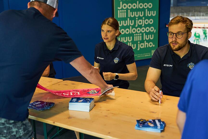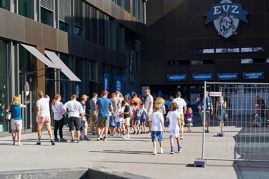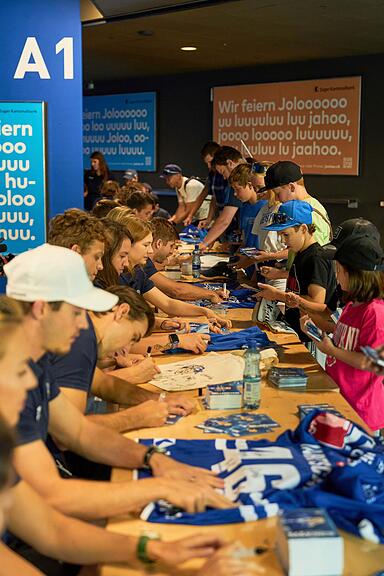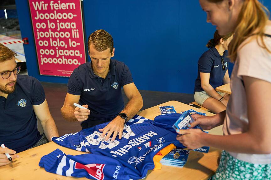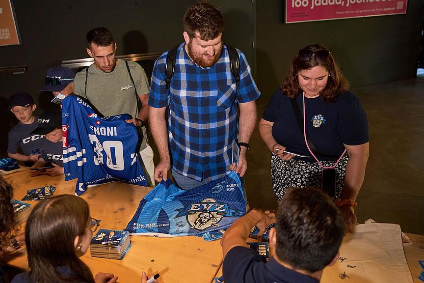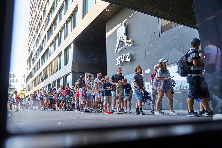 Meter lang reihen sich Tische mit Athleten und Athletinnen des EVZ am Eingang der Bossard-Arena.