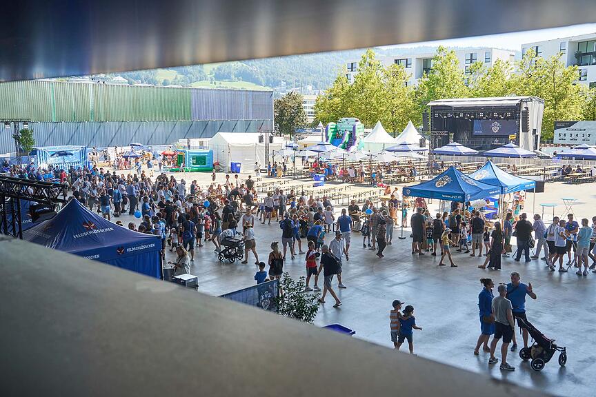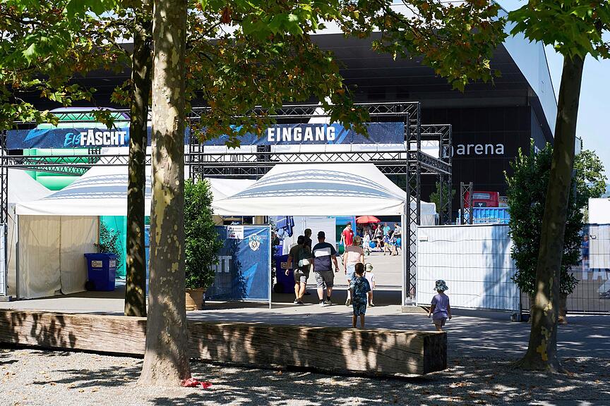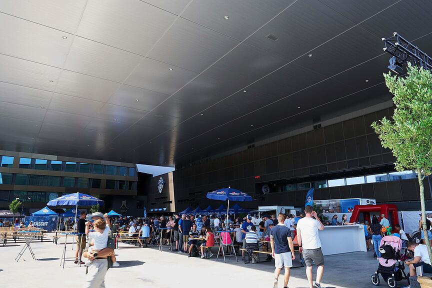 Das gewaltige Dach der Bossard-Arena ist der beste Schattenspender an diesem heissen August-Tag.
