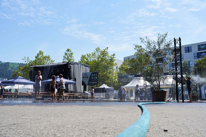 Wer möchte, gönnt sich eine Abkühlung mit Wasser, welches in die verschiedenen Schläuche geleitet wird.