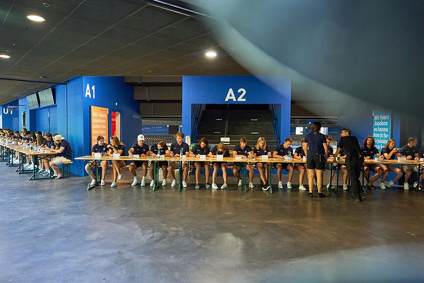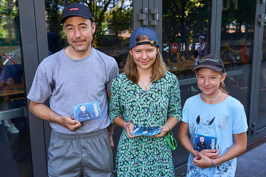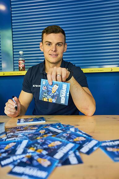 Gregory Hofmann hat bereits vorgearbeitet wie seine Kameradinnen und Kameraden und einen ganzen Stapel mit unterzeichneten Autogramm-Karten vor sich liegen.