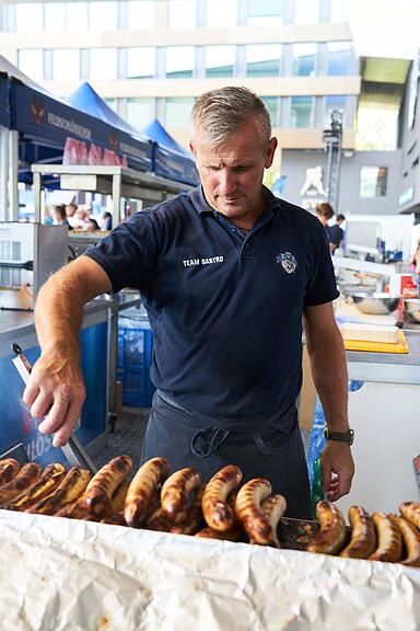 Jetzt ist der Grill noch prall gefüllt. Doch schon bald kommen die hungrigen Gäste und der Grillmeister fängt wieder von vorne an.