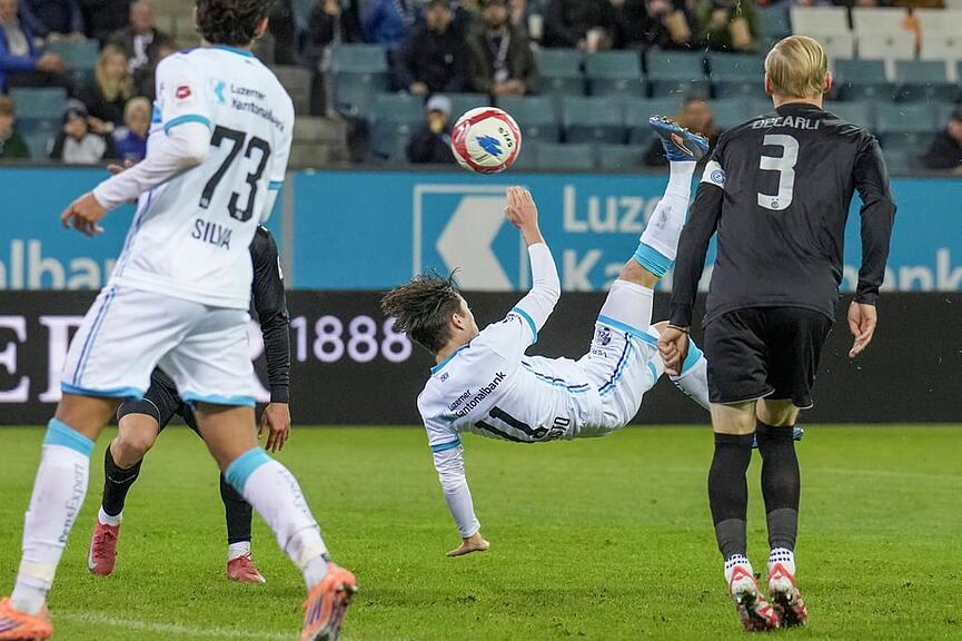40. Minute: Der dritte Treffer für den FC Luzern ist absolut sehenswert. Der FCL erhält einen Freistoss knapp ausserhalb des Strafraums. Von Moos läuft an und hämmert den Ball mit seinem linken Fuss oben links ins Eck.