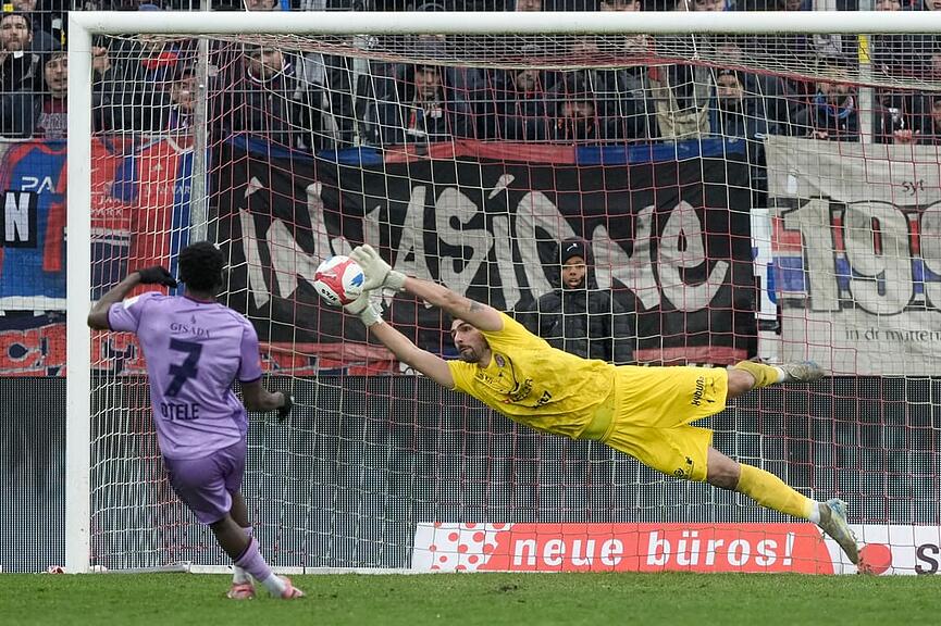 Otele's halbhoher Schuss in die linke Ecke ist leichte Beute für FCW-Keeper Stefanos Kapino. Es ist der dritte vergebene Elfmeter in Folge.