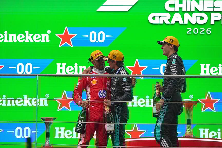 Schon am Samstag beim Sprintrennen gab es für Hamilton Champagner. Der Brite wurde Dritter hinter seinem Teamkollegen Charles Leclerc und dem Mercedes-Fahrer George Russell. Sprints geben im Vergleich zu gewöhnlichen Rennen weniger Punkte.