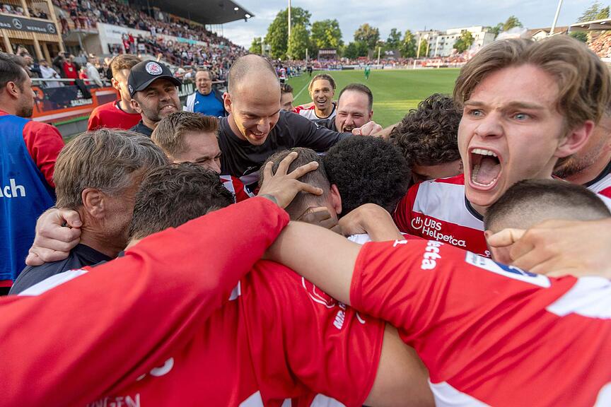 Fabian Frei, der 36-jährige Routinier beim FC Winterthur, der am Saisonende zurücktritt, lässt sich nach seinem glücklichen Penaltytor überschwänglich feiern. Nach seinem Tor rennt er auf die Tribüne, wo er sich von seinen Liebsten umarmen lässt. «Das war einer aus der Kategorie ‹souverän verwandelt›», sagt Frei später bei «Blue Sport» sarkastisch. «Mir rutschte das Herz in die Hose, als ich sah, dass Bernardoni stehen bleibt.»