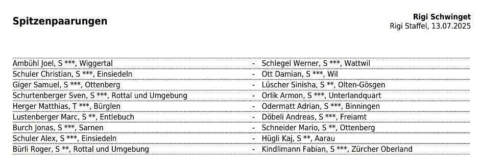 Innerschweizer/Nordostschweizer Paarungen gibt es dann aber trotzdem mehrere im 1. Gang. Joel Ambühl tritt gegen Werner Schlegel an, Christian Schuler gegen Damian Ott. Und Sven Schurtenberger gegen Armon Orlik. Aus dem Nordwestschweizer Verband stehen unter anderem auch die Eidgenossen Adrian Odermatt (gegen Matthias Herger) und Andreas Döbeli (gegen Marc Lustenberger) am Start.