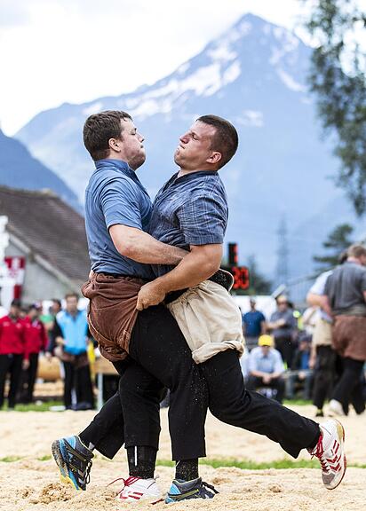 Reto Nötzli tut sich schwer mit Stefan Ettlin. Fast verliert er gegen den Kernser, doch eine Minute später ist es Ettlin, der mit den Schulterblättern im Sägemehl liegt. Zweiter Sieg für Nötzli.