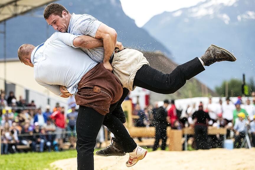 Die absolute Spitzenpaarung: Pirmin Reichmuth (ZG) gegen Armon Orlik (GR). Drei Festsiege 2019 gegen fünf Festsiege 2019. Sie sind in diesem Jahr bislang die besten Schwinger und gehören zum Favoritenkreis auf den Schwingerkönig-Titel. Orlik greift früh an, Reichmuth wehrt den Angriff aber gekonnt ab. Und so endet der Gang gestellt.