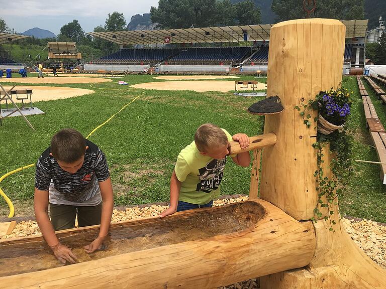 Diese Jungschwinger probieren schon einmal den Brunnen aus. Die Grossen werden es ihnen morgen gleichtun.