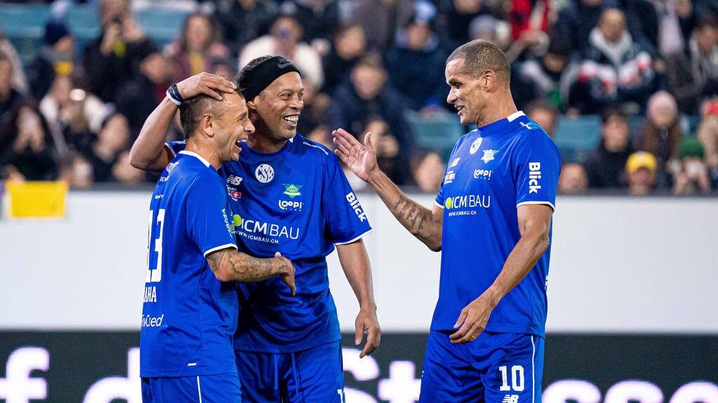 Die Ankunft wird sehnsüchtig erwartet. Um 17.59 ist es soweit. Mehrere Bentleys fahren vor, aus dem zweiten, einem grünen Auto, steigt der Superstar. Weisse Mütze, grosse Brille, blaue Jacke und weisse Sneakers. Ronaldinho winkt den zahlreichen Fans, die noch immer vor der Swisspor-Arena ausgeharrt sind, um den brasilianischen Ex-Fussballer zu sehen. Ronaldinho winkt und zeigt sein unverkennbares, breites Lachen.